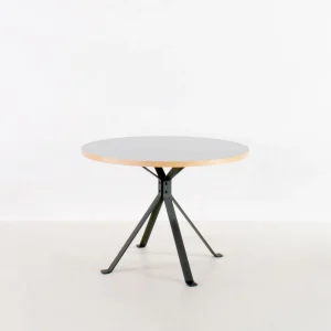 CROSS LEG TABLEの天板は、天然素材を原料としたリノリウムとオーク材のコンビネーション。無機質で端正な印象のスチール素材の脚が、存在感をさらに引き立てます。